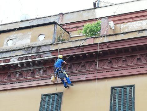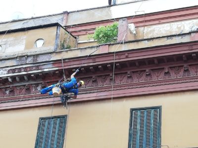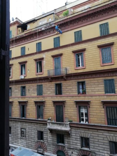Qui si può misurare l’impresa. Il Ragno sale dalla via, azionando moschettoni, tiranti, carrucole. Porta tutto con sè. Prima di iniziare il lavoro fotografa le zone ammalorate che deve risanare. Un aiutante lo controlla dal basso, ferma i passanti nei momenti in cui è prevedibile la caduta di frammenti, li invita a transitare sotto la tettoia che prima hanno costruito per il passaggio pedonale e che si vede in basso a sinistra. Tiene a bada signora e cagnetta che si affacciano al più basso dei due balconi. La cagnetta abbaia vedendo salire il rampicante a un metro dal terrazzino. La signora alza le mani come a dire “mannaggia” e poi le abbassa e le allarga per dire “Gesù”.