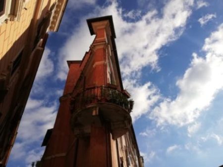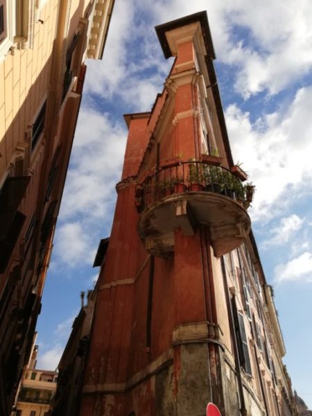 Incroci ad angolo acuto sono frequenti nel Rione Monti, dove l’Asse Sistino – cioè voluto da Papa Sisto – venne a sovrapporsi in diagonale al reticolo quadrangolare della Suburra. Sulla destra in basso della foto che è al commento precedente si vede la cupola della Cappella Sistina di Santa Maria Maggiore. La via Caprareccia, che scorre sulla sinistra del palazzo a prua, ha il nome dal passaggio di greggi di capre. Le immagino barbetta in aria a intrecciare belati con una capretta domestica che saltella sullo spensierato terrazzino.