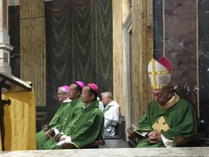Essendo fuori per volontariato carcerario – vedi post del 4 ottobre- mi sono perso la venuta in parrocchia dei due vescovi cinesi che sono a Roma per il Sinodo e che vedete nella foto. Siamo nella chiesa di Santa Maria ai Monti, bella. Il celebrante con mitra è il cardinale Francesco Coccopalmerio. I due cinesi si chiamano Giovanni Battista Yang Xiaoting vescovo di Yan’ An (Shaanxi), quello in primo piano; e Giuseppe Guo Jincai vescovo di Chengde (Hebei) alla sua destra. Il terzo vescovo è Leonardo Gomez emerito di Chiquinquirà (Colombia), che è a Roma per partecipare domenica 14 alla canonizzazione di Paolo VI e di Oscar Romero. Nei commenti il saluto all’assemblea del vescovo Yang Xiaoting e altre notiziole. Avevo segnalato qui nel blog l’impegno della mia parrocchia verso la Cina, ricompensato da questa ospitalità di cui sono felice.