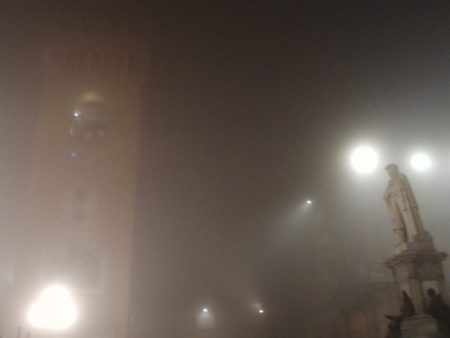 Un saluto da Recanati: questa è la piazza del comune con insolita nebbia. Sulla destra il pensoso Giacomo Leopardi, che i compaesani chiamano il Gobbo. Sulla sinistra la Torre del Borgo. Nei commenti il percome io sia qui e due ciarle sul Gobbo e la sua Torre.