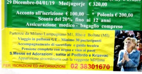 Pur nel rispetto di chi vuol credere alle apparizioni di Medjugorje, faccio notare che in questo manifestino, per come graficamente è composto, in pratica sono già previste due apparizioni “straordinarie” per i pellegrinaggi del 29 dicembre 2018 e del 4 gennaio 2019. Questo significa che la Vergine Maria ha già preso impegni con Mirijana? Chi vuole ovviamente è libero di crederci.