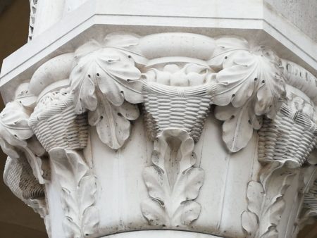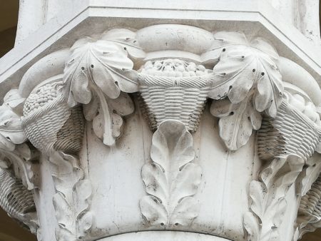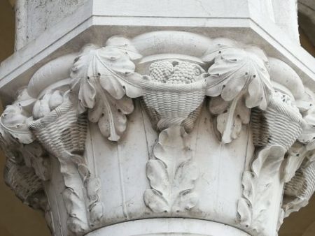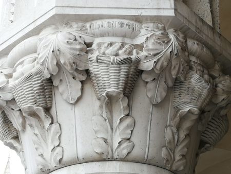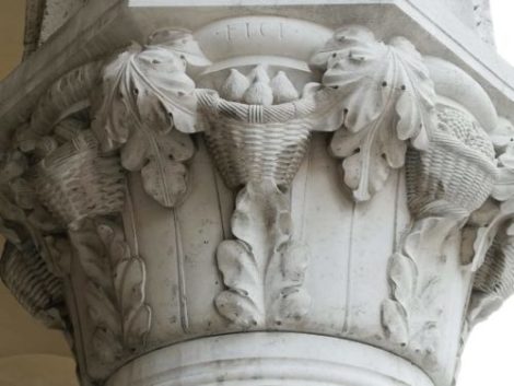 Sono innamorato dei capitelli del Palazzo Ducale che si vedono lungo il loggiato che dà sulla Piazzetta e sul Molo. Quello che amo di più è il decimo del fronte in Piazzetta a contare dalla Porta della Carta. Espone otto ceste di frutta e la mia preferita è quella con i “fici”. Sono un buon mangiatore di fichi e li gusto anche con gli occhi. Sono stato a Mestre e a Venezia nei giorni scorsi per un paio di conferenze e sono tornato al mio capitello. Ho fotografato tutte le ceste. Le metto in ordine di giro antiorario intorno alla colonna, una per commento. A partire si capisce dai fici. I nomi che sono incisi sul “rigonfiamento della campana del capitello” li ho interpretati con l’aiuto del volume “Il Palazzo Ducale di Venezia illustrato da Francesco Zanotto” (1842). Le ceste di frutta sono elencate alla pagina 258. Chi non fosse soddisfatto delle trascrizioni e traduzioni – io non sempre lo sono – se la prenda con lui. Ma vi avverto: è un chiacchierone da paura.