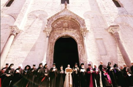 “Ecco la rivoluzione di Gesù, la più grande della storia: dal nemico da odiare al nemico da amare. Se siamo di Gesù, questo è il cammino! Non ce n’è un altro”: così ha parlato domenica il Papa a Bari nell’omelia della messa, dopo l’incontro con i vescovi del Mediterraneo, del quale ho riferito nel post precedente. Riporto nei commenti i passaggi dell’omelia che fanno più luce. Li metto staccati l’uno dall’altro per invitare i visitatori a leggerli lentamente. Li commento con una foto della precedente visita di Francesco a Bari, quella del 7 luglio 2018, quando vi andò a incontrare i patriarchi e i vescovi del Medio Oriente. Ho scelto quella perché volevo la sua luce a commento delle parole del papa. Luce di luglio sulla pietra di Puglia.