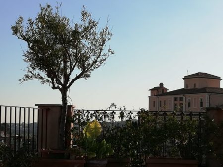 Dialoghetto in tempo di pandemia. Dove tutti andiamo ai terrazzi e ci conosciamo lassù. Quando ci vado a camminare saluto tutti intorno. E non conosco nessuno. Dopo il taglio dei rami me ne stavo andando, ero arrivato alla porta che dà sulle scale e ho sentito quelle parole. Il “bellissimo”, purtroppo, non era per me ma per la scena da fotografare. Tuttavia mi ha fatto simpatia che quella parola fosse in una frase che circolava nei miei paraggi. Mi chiedevo scendendo: chissà se le due signore, che potevano essermi figlie, collegavano i due rametti alla Domenica delle Palme. Ho lasciato aperta la domanda.