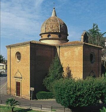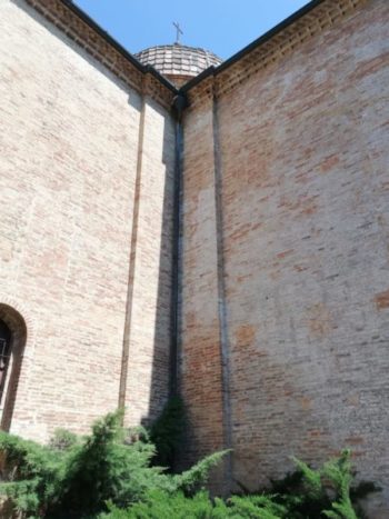 La foto dice quanta bellezza può venire dall’incontro di due schiette pareti con cupola. L’informazione della guida rossa, che annunciavo al commento precedente, è questa: “Curiosa, nell’architrave di una porta, è l’iscrizione ‘Terribilis est locus iste’ che ammonisce come subito dopo la chiesa vi sia una curva pericolosa, certo tra le più antiche segnalazioni stradali”.