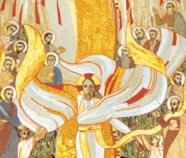 Primizie dei risorgenti. La grande raffigurazione rupnikiana illustra il ritorno di Cristo alla fine dei tempi: questa che vediamo è la sola parte alta del mosaico, che un poco ho ritagliato anche ai lati. Nella parte bassa è la distesa di Ossa Aride del capitolo 37 del profeta Ezechiele: Cristo scende e le ossa riprendono carne e vita. Scende accompagnato dai dodici apostoli e tende le mani a un uomo e una donna, primizie dei risorgenti. Le sue vesti sono mosse dal soffio dello Spirito – il Vento dell’Ultimo giorno – che allieta i beati e ravvisa le ossa. Nel commento seguente metto uno spunto a traino della “pizza e vangelo” di domani [vedi post precedente].