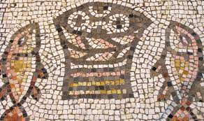 Due pesci ai lati di un paniere con pani segnati dalla croce: mosaico pavimentale di una basilica bizantina del IV-V secolo nella località di Tabga, sulla costa occidentale del lago di Tiberiade, riscoperta dagli archeologi nel 1932. Con questa immagine accompagno la registrazione audio della lectio di Pizza e Vangelo del 24 gennaio nella quale abbiamo letto la prima moltiplicazione dei pani narrata da Marco nel capitolo sesto del suo Vangelo