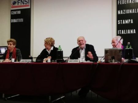 Siamo nella Sala Walter Tobagi della Federazione nazionale della Stampa, in Roma, martedì 29 gennaio ore 17.00 per la presentazione del libretto di Carlo Di Cicco, che è l’ultimo a destra. Alla sua destra Mario Capanna, ultima a sinistra Mariella Enoc presidente dell’Ospedale Bambino Gesù. Tra Capanna e la Enoc c’è Laura Trovellesi, moderatrice.