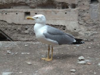 Eccomi in contegnoso motteggio con un gabbiano di nome Albularius sulla rampa imperiale che porta dal Foro Romano al Palatino. Ci diamo appuntamento qui perché apprezziamo le muraglie della Domus Tiberiana e perché entriamo gratis essendo ambedue giornalisti.