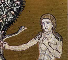 Può darsi che sia Eva ad ipnotizzare il serpente e che questi ,il serpente, ne sia rimasto tanto conturbato al punto da offrire alla donna [che nella concezione ebraica, e non solo, deve sempre fare i conti con la limitazione della propria libertà) una visione del mondo e di Dio alternativa. Nel contesto [ e il brandello musivo del Duomo, fantastico , di Monreale] se lo si osserva con attenzione si evidenzia quel fine gioco psicologico fatto di sguardi e ammiccamenti : il serpente coinvolgerà prima la donna, che trascinerà seco la volontà -ancora dormiente- di Adamo, ed entrambi si renderanno complici nell’atto dell’atavica ribellione …