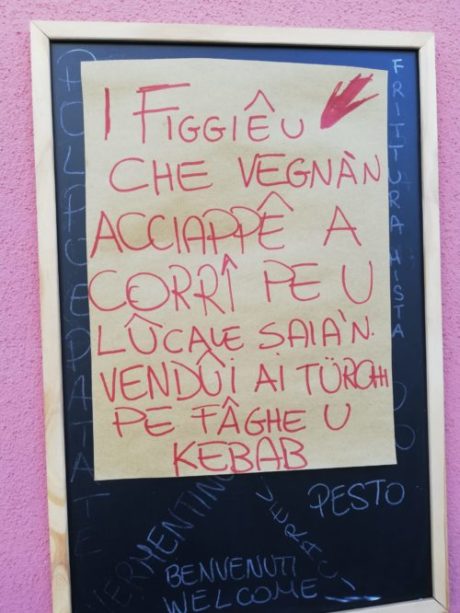 Cartello in volgare ligure che ho fotografato ieri a Sestri Levante, sulla porta di una pizzeria in via Antica Romana Occidentale, civico 69, accanto al sottopasso per la stazione. Traduzione in fiorentino antico: I figlioli che saran colti a correre per il locale saranno venduti ai turchi per farci il kebab.