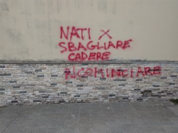 Da dove viene la foto. Chiedo scusa ai visitatori: ho inserito la foto ieri ma per ragioni di connessione – sono a Sestri Levante – non sono riuscito a mettere la fonte prima di stamane. Quella scritta l’ho fotografata qui a Sestri, in via Olive di Stanghe, su un muro a destra di chi va al mare.
