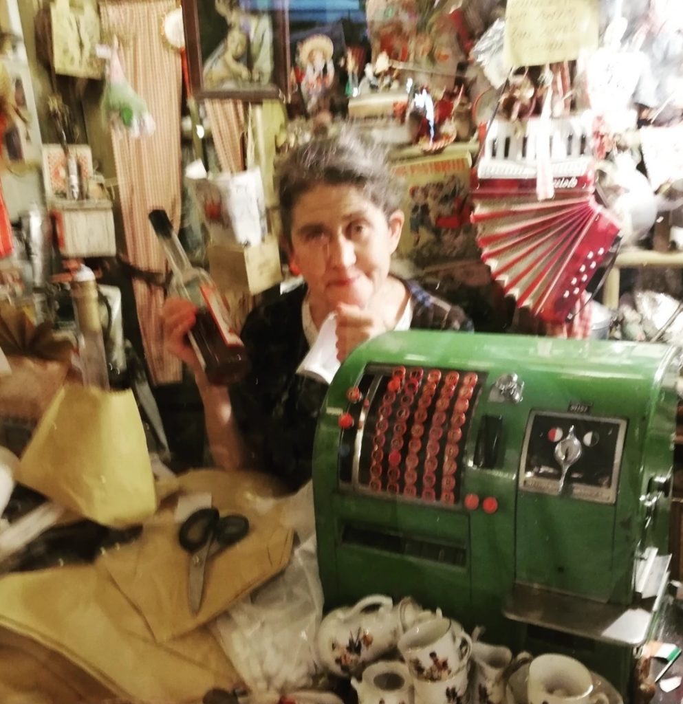 Marcellina nel suo negozio di Abbadia San Salvatore. Nei commenti il come e qualmente e altre foto del fantasioso bazar