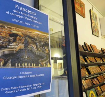La pioggia battente, probabilmente, ha fatto si che ci fosse qualche sedia vuota, ma non ha impedito l’ottima riuscita dell’incontro (scontro) Accattoli/Rusconi: entrambi professionisti, entrambi preparatissimi . Avvolti dal profumo inebrante di ottimo incenso, circondati dall’oro di ieratiche icone – portatrici di realtà segrete- che sembravano scrutarci severe che dire: anche se pochi ,ciascuno ha dato il proprio contributo in una friendly atmosphere molto edificante. A me è piaciuto tantissimo tanto che parteciperò anche al prossimo…
