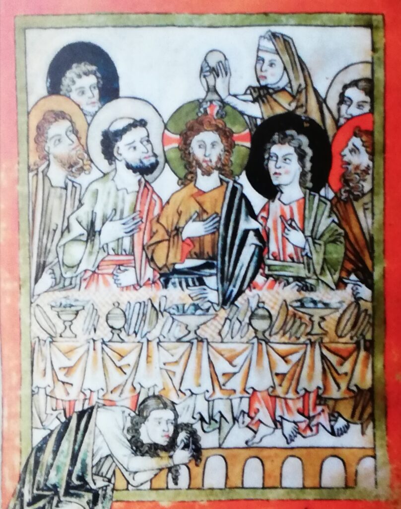 Unzione di Betania – miniatura del Salterio di Basilea – 1260 – conservato nella Biblioteca di Besançon – in essa è raffigurata una donna che versa il profumo di un vasetto sulla testa di Gesù, come narrano Marco e Matteo; e un’altra che versa il profumo sui suoi piedi come raccontano Luca e Giovanni. Un’immagine straordinaria per lettori dilettanti della Bibbia quali siamo noi che ci colleghiamo via Zoom alle serate di Pizza e Vangelo. Con questa miniatura introduco la scheda di preparazione dell’appuntamento di lunedì 22 aprile alle 21.00. Nei commenti la scheda e l’invito dei visitatori e collegarsi: leggeremo l’unzione di Betania com’è presentata da Marco ad apertura del capitolo 14 del suo Vangelo