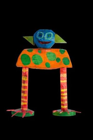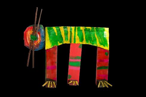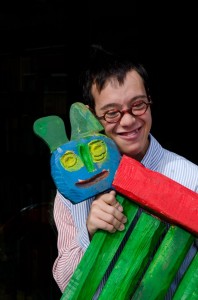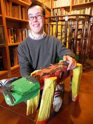 Come narrato in un post di tre giorni addietro, il 2 gennaio ho visto a Milano, nella Sala Biagi della Libreria Rizzoli, in Galleria, dieci lavori di Paolo Guerriero, mio amico Down di 28 anni che è alla sua terza mostra [sarà visibile fino al 20 gennaio]. Festeggio l’incontro con un bicchiere di Vino Nuovo e qui riporto cinque foto dei suoi lavori che sono sculture in legno e dipinti. Nella prima c’è Paolo che saluta i miei visitatori abbracciato al “Cane a cinque zampe” che dà il titolo alla mostra: Cinque velocissime zampe. Paolo ama il fuoco – “mi piace guardarlo” – gli animali e i colori forti, per primo il rosso che è amico del fuoco. Le foto narrano queste sue passioni.