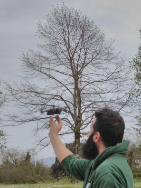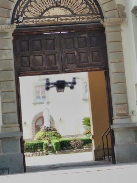 Il piccolo drone è come un giocattolo. la bacca di cipresso in conversazione con lui sul piazzale della Certosa dà un’idea della misura.