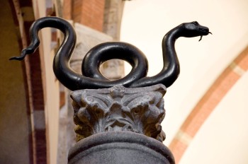 Siamo in Sant’Ambrogio di Milano, “quello vecchio, là, fuori di mano”. Sulla colonna romana di granito è collocato il bizantino serpente di bronzo del “Libro dei Numeri”, al quale Gesù si paragona nel Vangelo di Giovanni, evocato da Francesco l’altro ieri nell’omelia per i vescovi e i cardinali morti nell’anno. Una leggenda milanese vuole che la fine del mondo avvenga quando il serpente scende dalla colonna: non pare stia per farlo. Nel primo commento la mia “didascalia d’autore” – come si dice in gergo – pubblicata ieri dal “Corsera” insieme alla foto a pagina 10 con il titolo L’immagine biblica del serpente ‘che ci salverà dalla morte’.