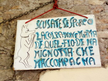 Per convertì l’abbrei. Foto scattata in via dei Neofiti, Rione Monti, dove un abitatore creativo di nome Umberto ha appeso al muro del Collegio dei Neofiti e dei Catecumeni, che tutte le ha viste nei secoli, quella diffida canina che più chiara non si può. La Confraternita dei Catecumeni e Neofiti viene addirittura da Ignazio di Loyola. Al Collegio maschile ch’era qui s’accompagnò dipoi quello delle “Zitelle catecumene” ch’era più avanti, verso i Fori. I neofiti erano gli “abbrei” e altri non cristiani da portare a battesimo. Portarli era brigoso non sto a di’ quanto. Donde er bisogno der Colleggio. Tutto questo non è più ma le mignotte sono sempre e i loro figli pur’anco, donde il vivissimo stilema “fio de mignotta”. Cotesti fiji a vorte hanno cani. Ecco spiegato il cartiglio sano sano.