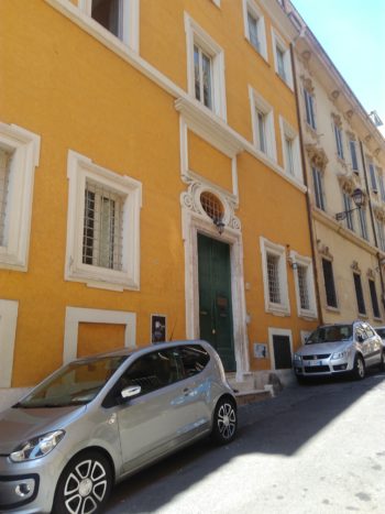 Antonella sono andato sul posto e ho fatto due foto per te. Non ci sono targhe o scritte murali, o nomi ai citofoni che indichino quale sia quello che fu Palazzo Fuccioli. Ho citofonato a due portoni e il secondo – al numero 8 di via Sant’Agata dei Goti – era quello giusto. La targa dice “Pia Casa di Carità”. Suor Sara che è venuta al portone mi ha pure dato un opuscoletto dov’è la storia della fondazione che risale a San Vincenzo Pallotti e qualche accenno all’edificio in cui quell’istituzione trovò posto nel 1838: “Il Collegio era sorto nel Seicento per la generosità di un prelato umbro: Giovanni Antonio Fuccioli, che l’aveva affidato ai Gesuiti”.