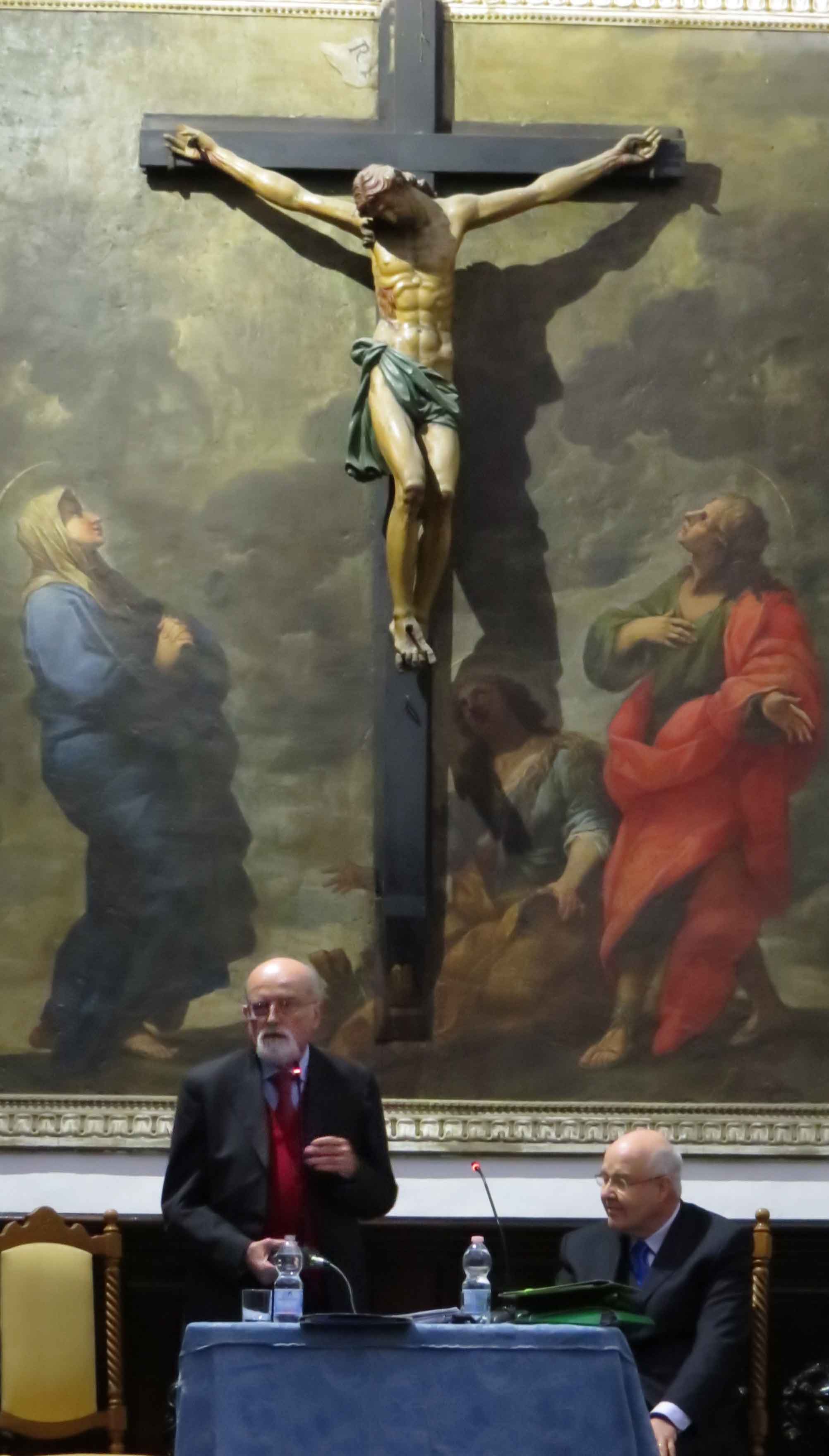 La Sagrestia della Madonna dei Monti ha carattere monumentale. Questa Crocifissione, in affresco e scultura, è attribuita alla scuola di Lazzaro Baldi (1623/24 – 1703). Quello in piedi sono io al prologo.