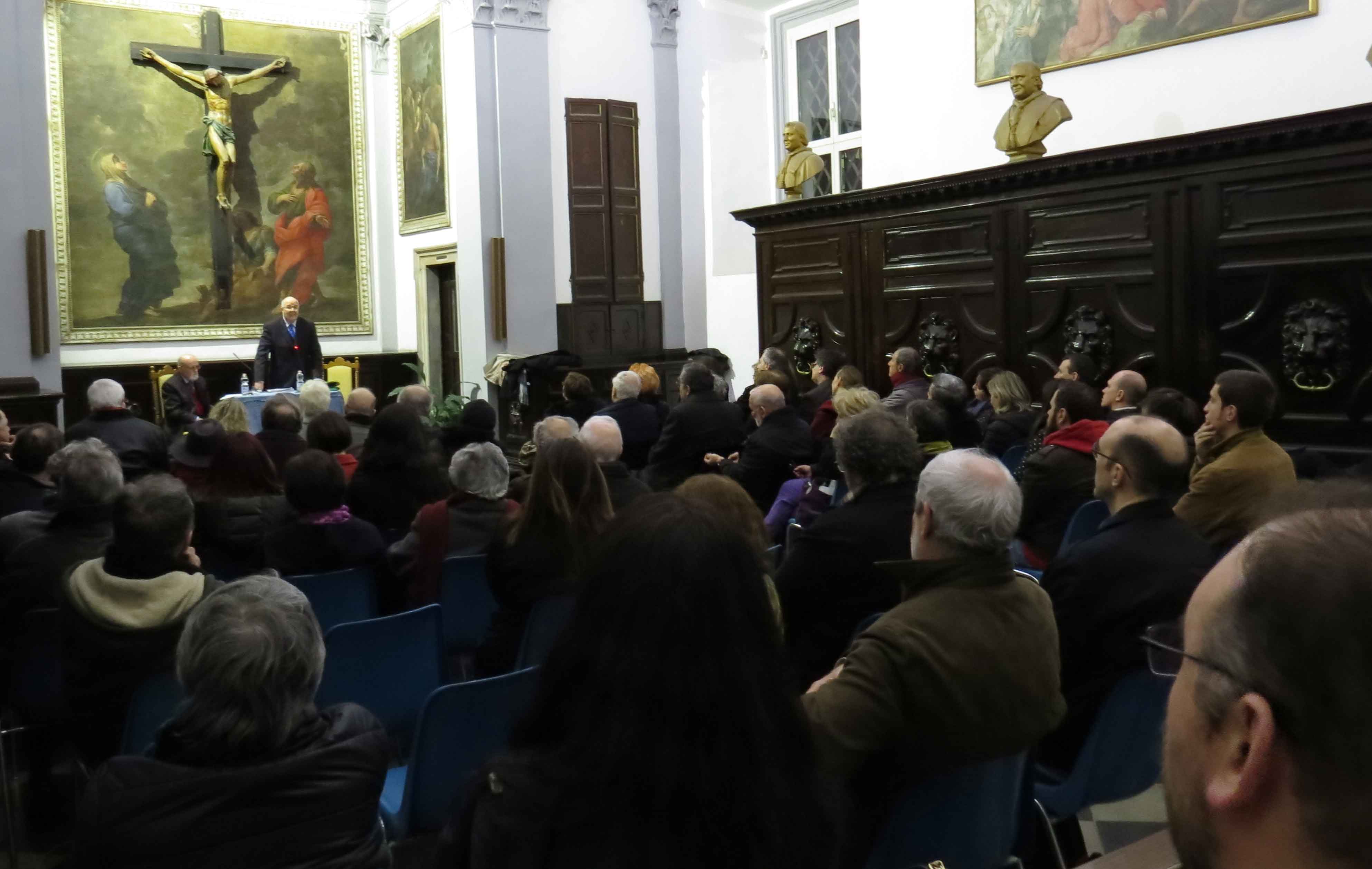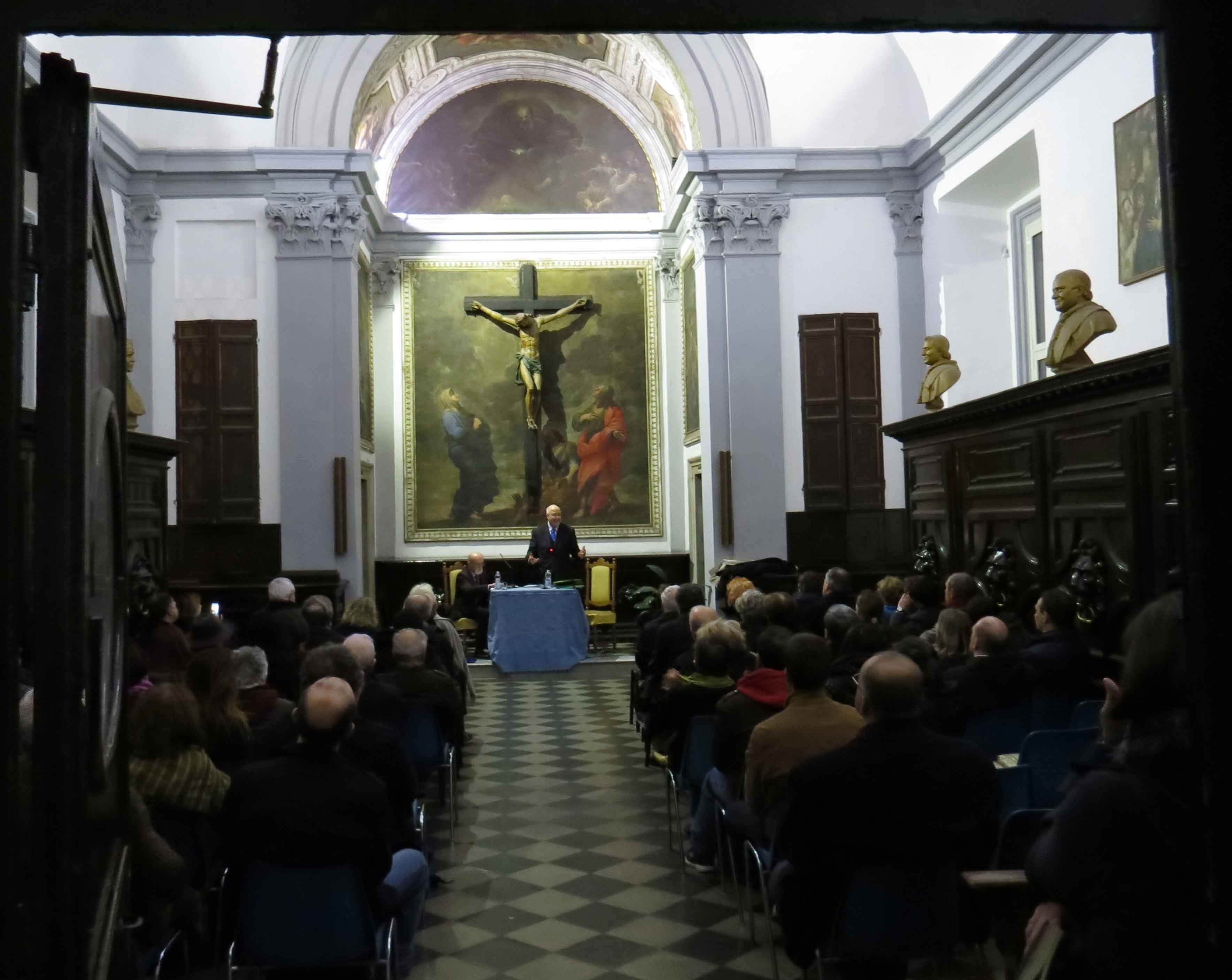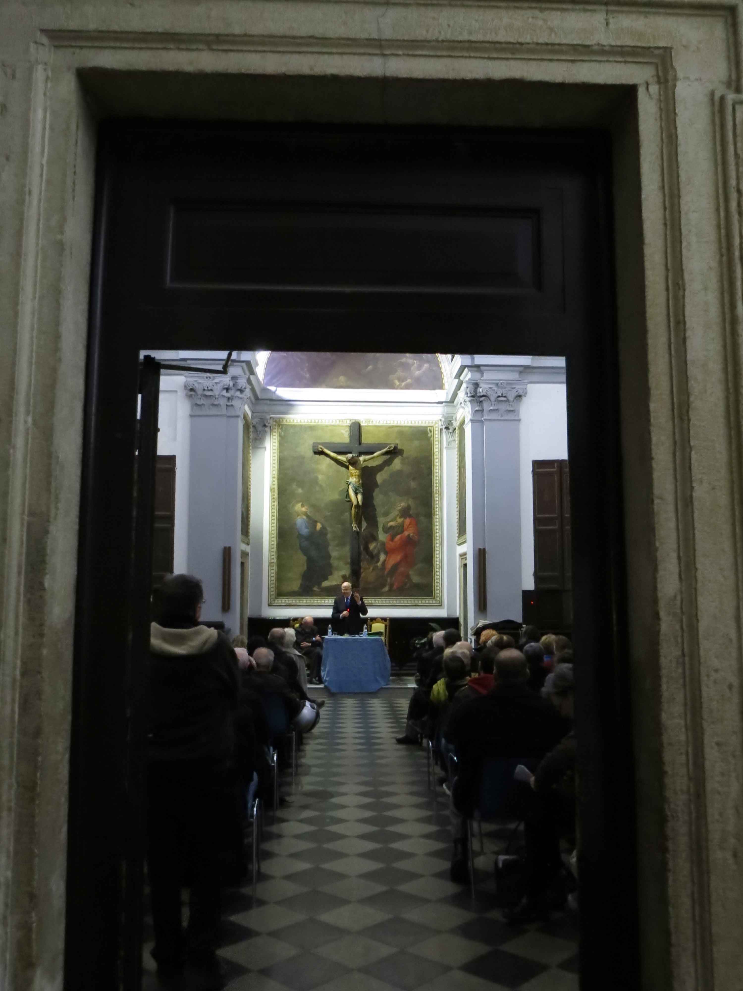 Questa foto è presa da fuori la porta della Sagrestia. Le ottanta sedie non sono bastate e prima dell’inizio sono state portate tre panche dalla chiesa. Sempre Rusconi al microfono, perché non si dica che a Monti non onoriamo gli ospiti.