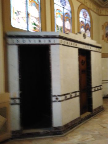 L’estate vagabonda mi porta a Sestri Levante dove trovo una chiesa con cripta e in essa due confessionali rivestiti di marmi: è il Tempio costruito dal padre Enrico Mauri (1883-1967) fondatore dell’Opera Madonnina del Grappa. Narrano all’Opera che il padre Mauri aveva Mussolini tra i benefattori e attendeva la sua conversione: quando fosse arrivata, il Duce avrebbe potuto inginocchiarsi tra i marmi che amava. A penitente imperiale il giusto confessionale.